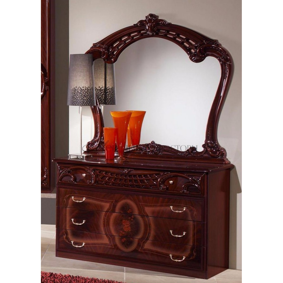 Комод Роза для белья Роза с зеркалом (могано) от Российской фабрики "ДИА мебель". Выполнен в классическом стиле. Цвет могано с глянцевым покрытием и орнаментом на фасаде придает этой модели еще больше элегантности. Большая объемная рамка в которую заключено зеркало, придает атмосферу богатства, а зеркало придаст комнате чувства легкости. Такой комод будет незаменимым модулем в вашей спальне.