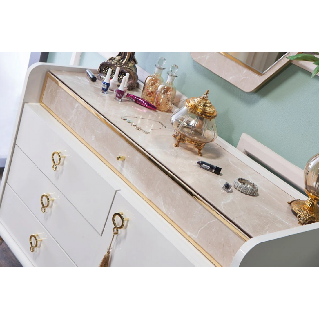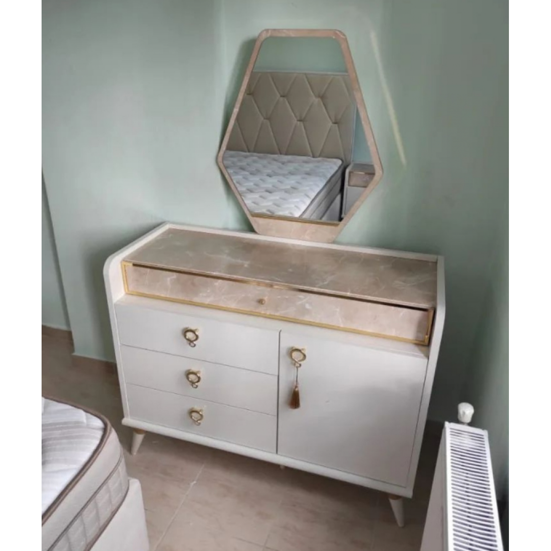 Комод- туалетный столик Monreal дополнит вашу спальню. В вернем ящике- разделитель отделанный тканью для украшений (можно не ставить), за дверцами- деревянная полка. Серия снята с производства.
