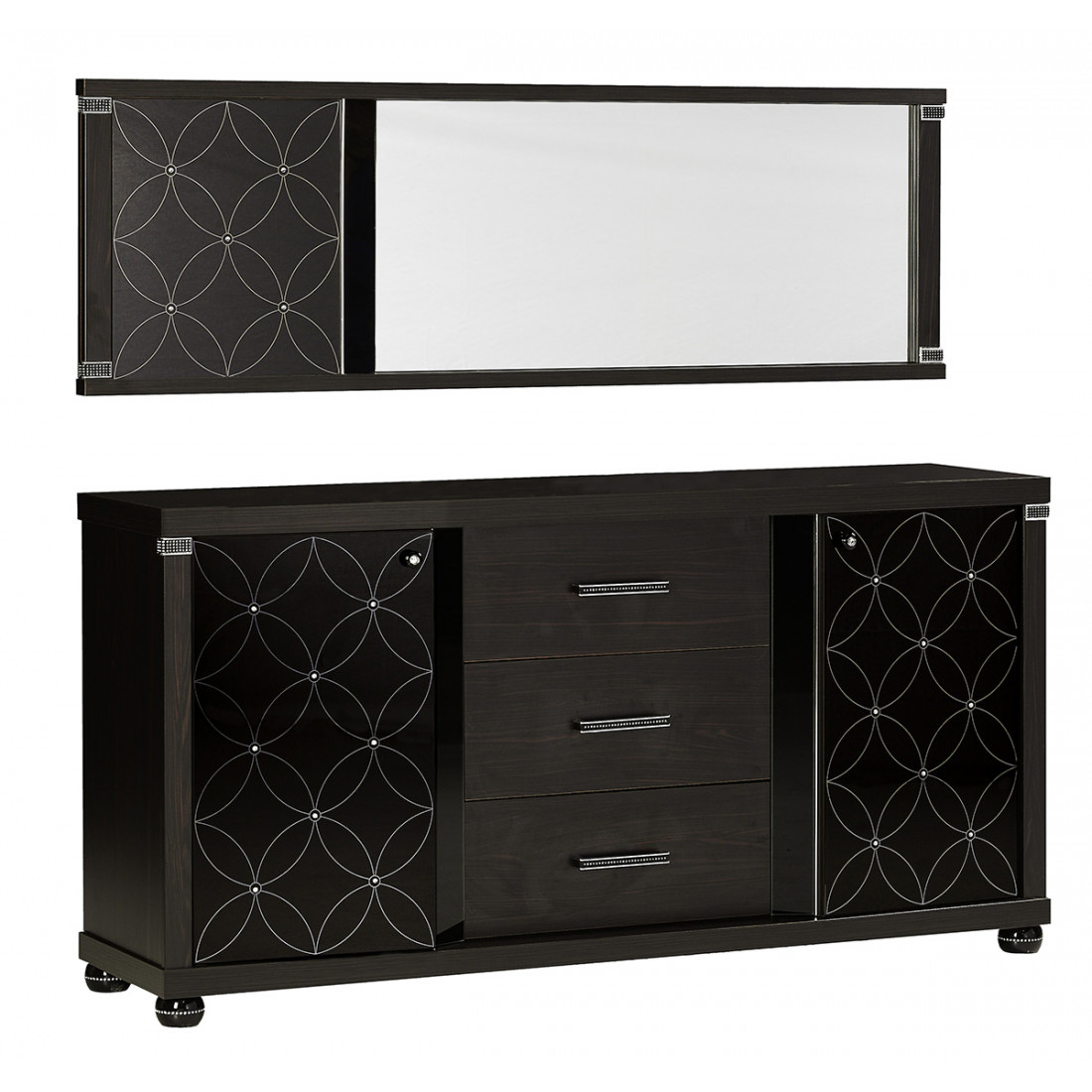 Прямоугольное настенное зеркало MIRA-10 (венге) серии Мира от Беллона наделено интересным эффектным дизайном. Помимо удлиненного зеркального полотна, в раме расположена вставка из черного каленого стекла с характерным для коллекции эффектным орнаментом, украшенным стразами . Купить настенное зеркало можно отдельно, рекомендуем в комплекте с удлиненным комодом серии Мира.