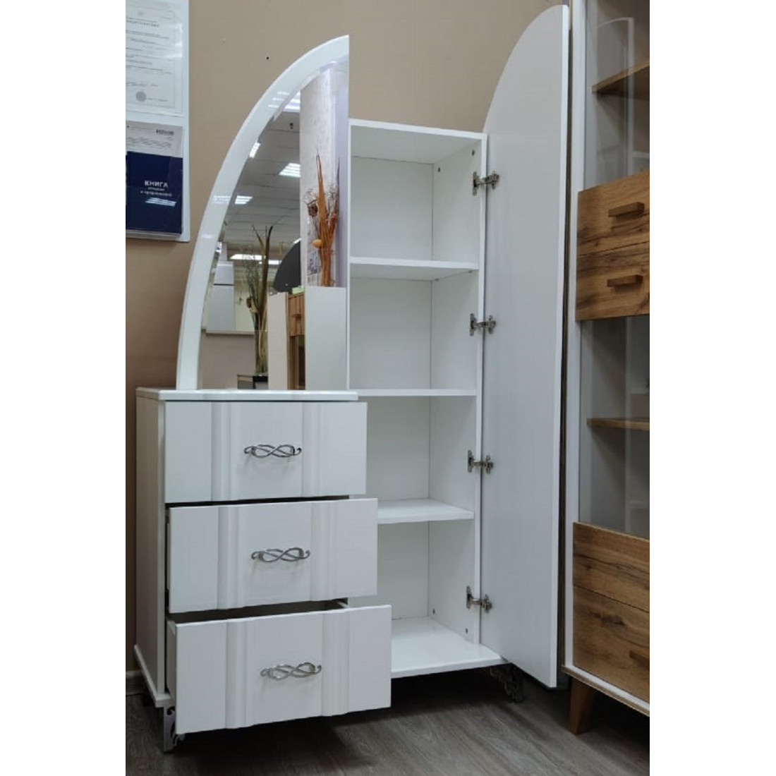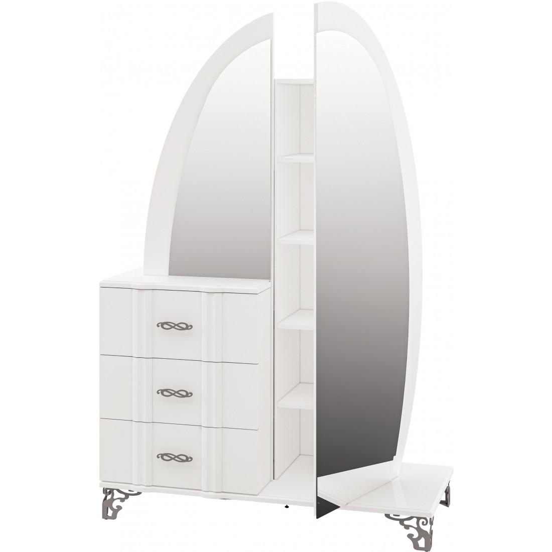 Комбинированный шкаф София МН-025-10 серии София от Мебель-Неман – очаровательная и неповторимая изюминка серии, способна преобразить классический интерьер до неузнаваемости. Округлой формы большое зеркало превратит спальню в роскошный аристократичный будуар, а тумбовые ящики заменят функционально комод. Купить комбинированный шкаф-трюмо – создать атмосферу элегантности и шарма в доме.
