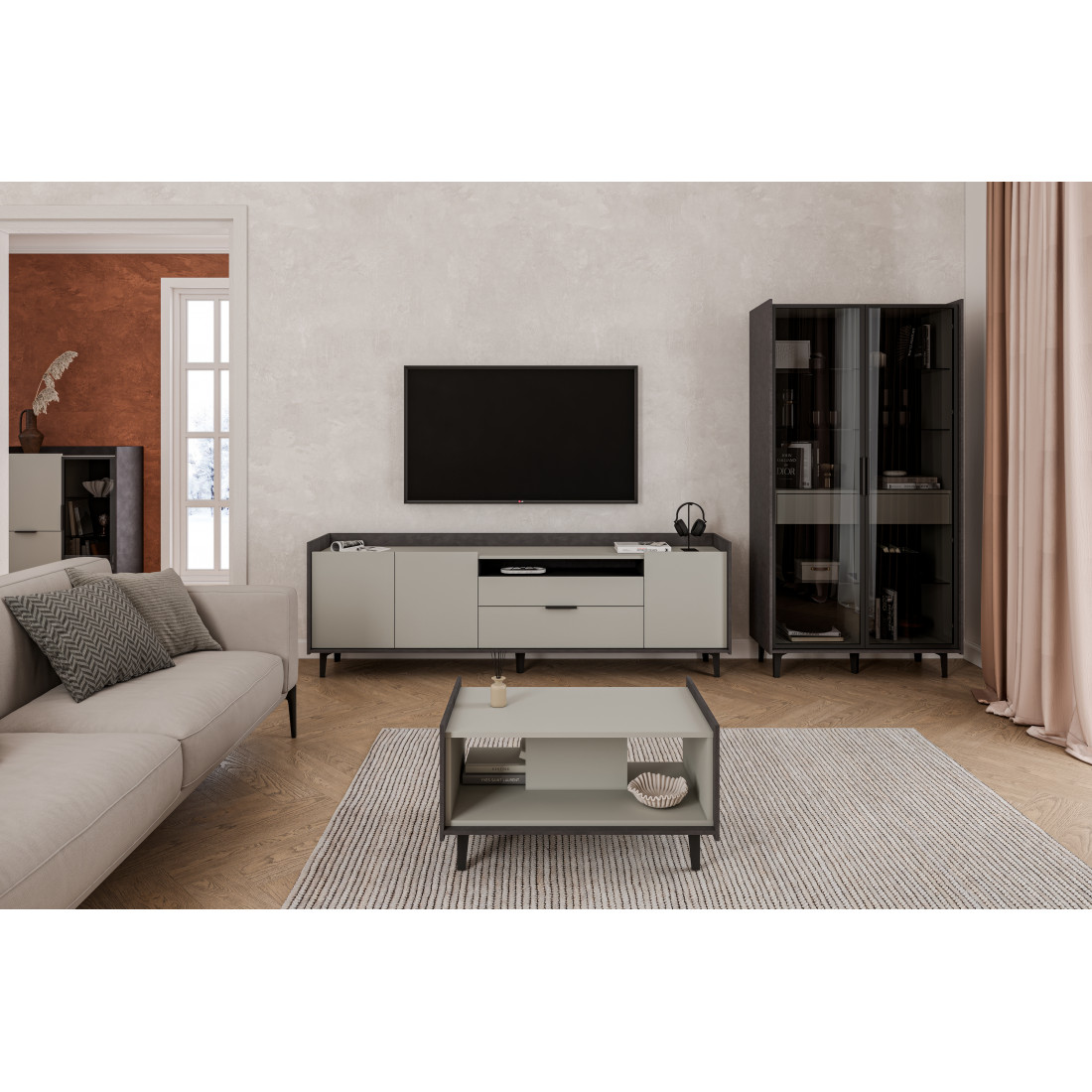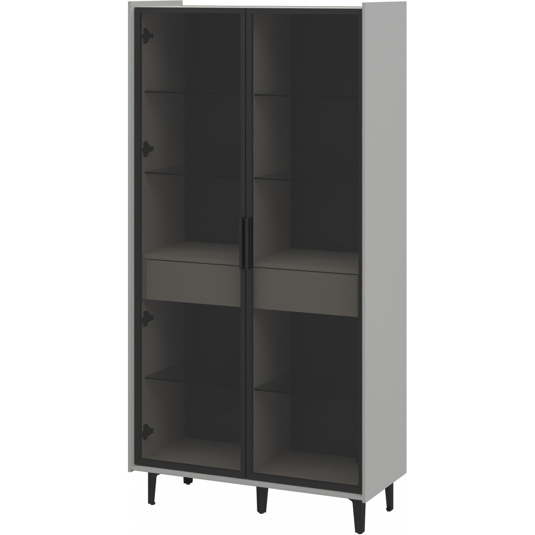 Элегантный шкаф Модена создает изысканную атмосферу в вашей гостиной. Предлагается в трех стильных вариантах цветов: Белый-Дуб Элисон, Лунный камень-жемчуг, Металл Бруклин-лунный жемчуг. Ножки из металла обеспечивают прочную поддержку. Темное стекло добавляет утонченности дизайну. Шкаф оснащен двумя отделениями с элегантными стеклянными полками и фасадами, между которыми находится большой ящик для удобного хранения. Идеальное решение для организации пространства в вашей гостиной