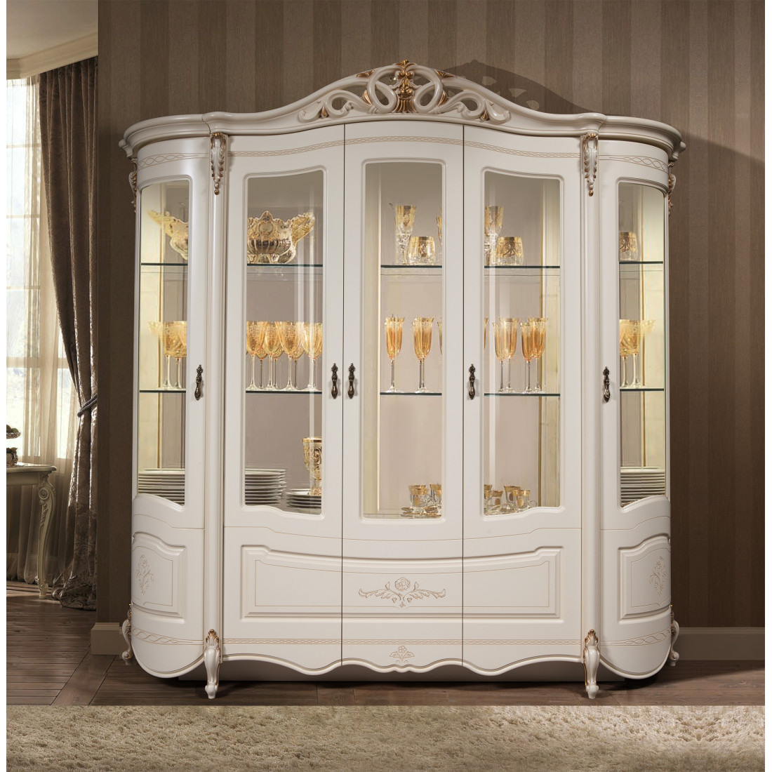 Шкаф-витрина пятидверная Аллегро 8 (белый) – данная модель сделает вашу гостиную неповторимой и нарядной. Ее стеклянные дверцы и зеркальный корпус придадут комнате светлую атмосферу, а стеклянные полки для посуды сделают эту витрину легкой и воздушной даже не смотря на ее мощный с первого взгляда фасад. Резные вставки в сочетании с тонкой росписью подчеркнут классический стиль и послужат показателем богатства и престижа хозяев дома.