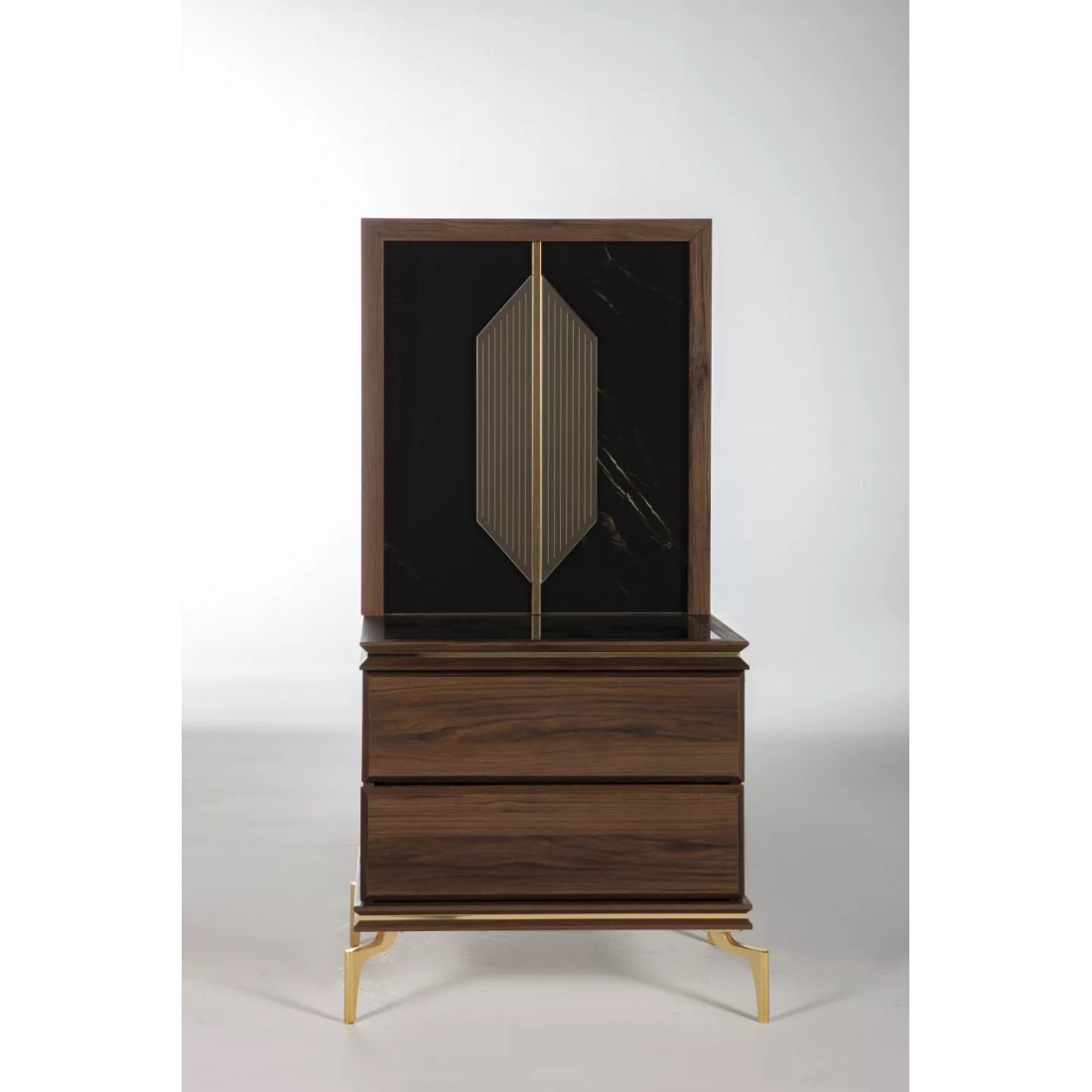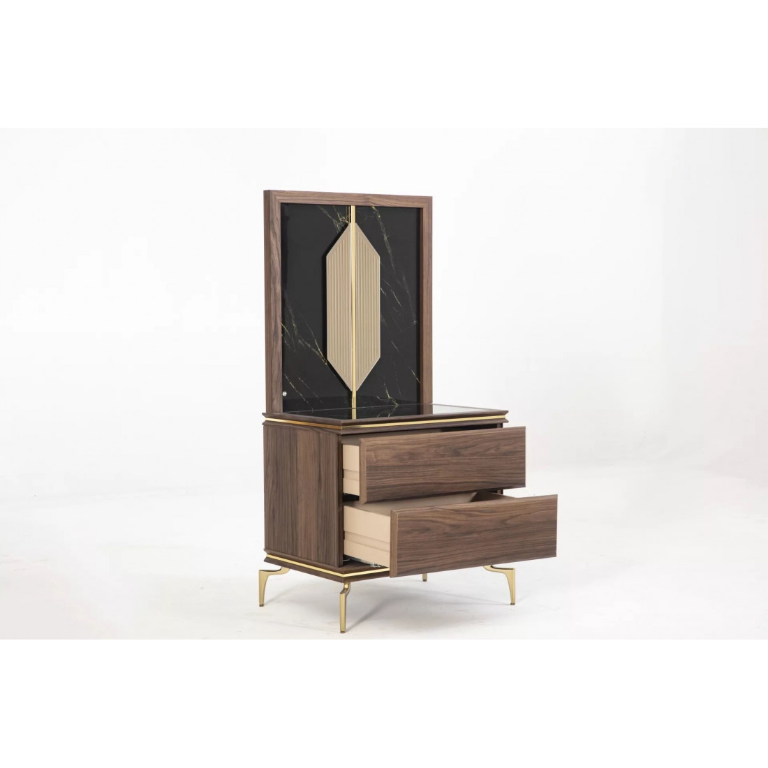 В цветовой конфигурации спальни "Montego" были предпочтительны цвета из черного мрамора с темным орехом. Специально разработанные для коллекции металлические ручки и ножки выполнены в ярко-золотом цвете, чтобы соответствовать стилю. Благодаря применению профиля в треугольной структуре, расположенной по всей системе, было получено визуальное богатство.