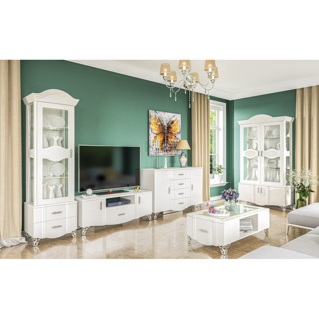 Тумба под телевизор в гостиную МН-025-16 серии София фабрики Мебель-Неман (Белоруссия) – гармоничное сочетание ультрасовременной лаконичности и изящества классических пропорций. Нежный кремовый оттенок глянца в сочетании с хромированным ажуром ручек и легких изящных ножек смотрится свежо и необычно. Купить классическую тумбу под телевизор София можно по доступной цене.