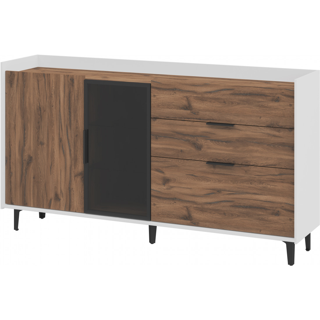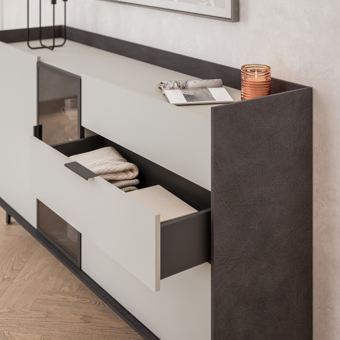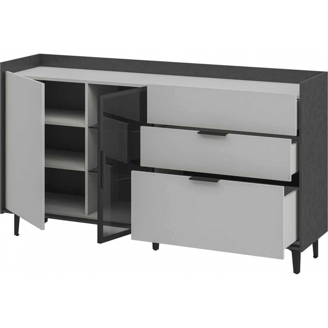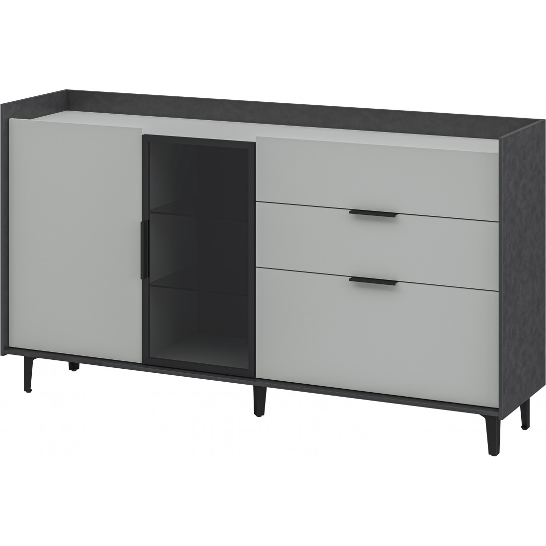 Элегантная тумба Модена создает идеальный акцент в вашей гостиной. Выберите из трех стильных вариантов цветов: Белый-Дуб Элисон, Лунный камень-жемчуг, Металл Бруклин-лунный жемчуг. Ножки из металла с регулировкой обеспечивают стабильность. Эта большая тумба идеально подходит для размещения телевизора и хранения посуды. Тумба оснащена темным стеклом и имеет три отделения: первое с двумя полками, второе с двумя стеклянными полками и фасадом из стекла, третье с тремя удобными ящиками. Функциональность и стиль объединяются в этой тумбе, делая ее идеальным дополнением к вашему интерьеру гостиной