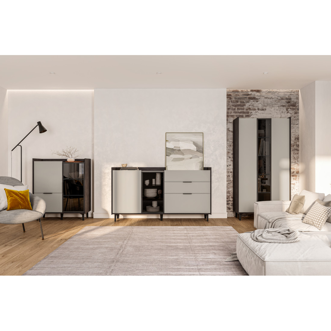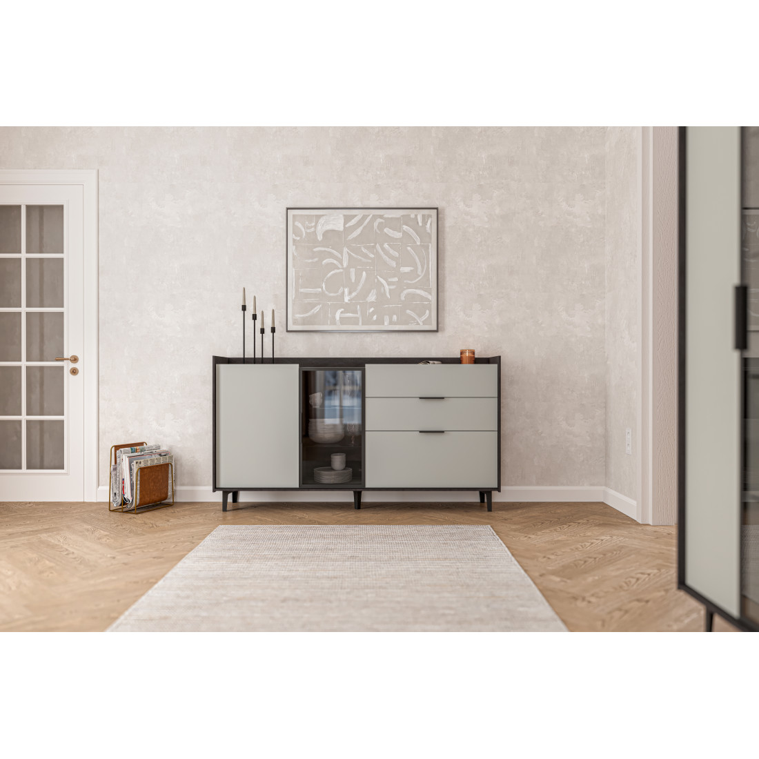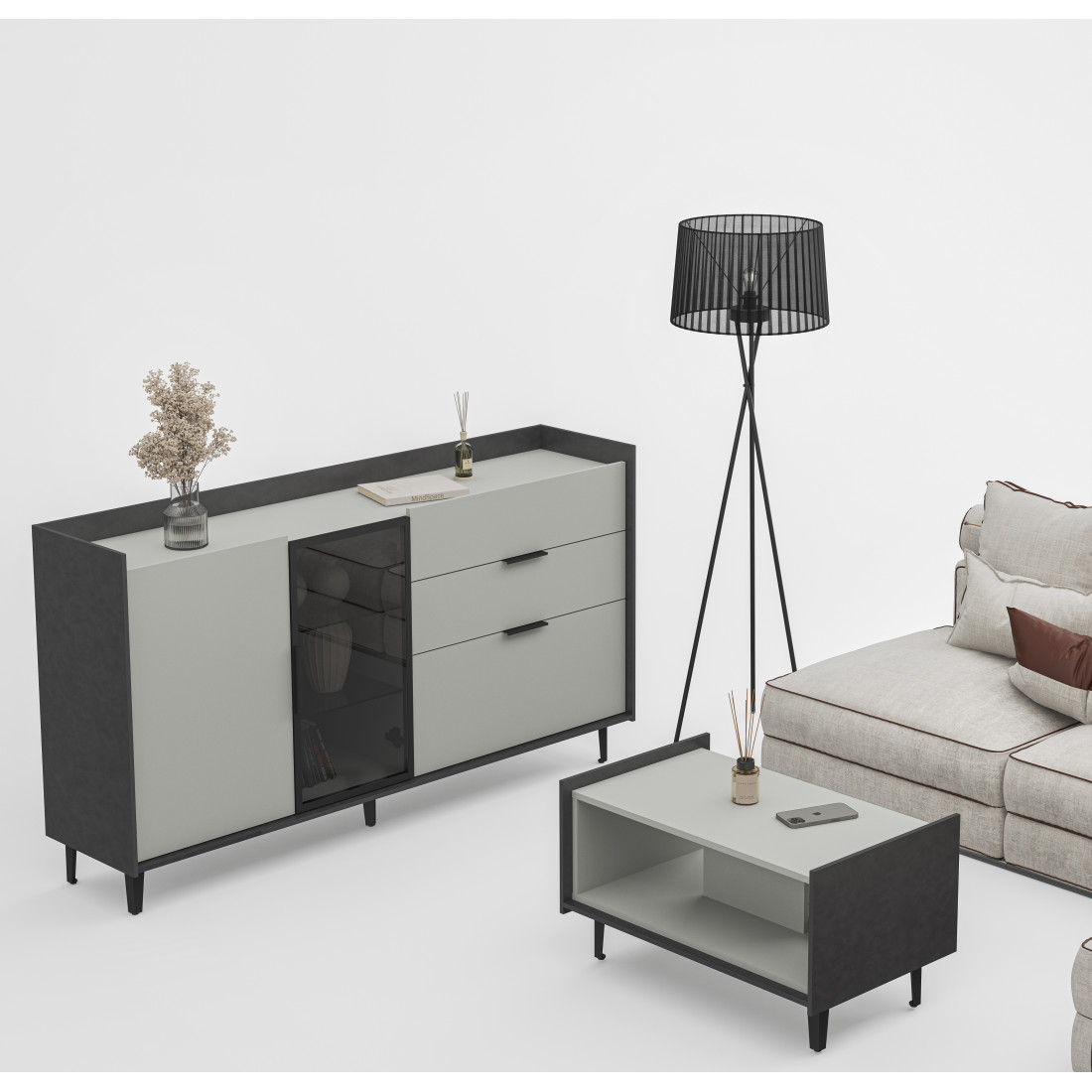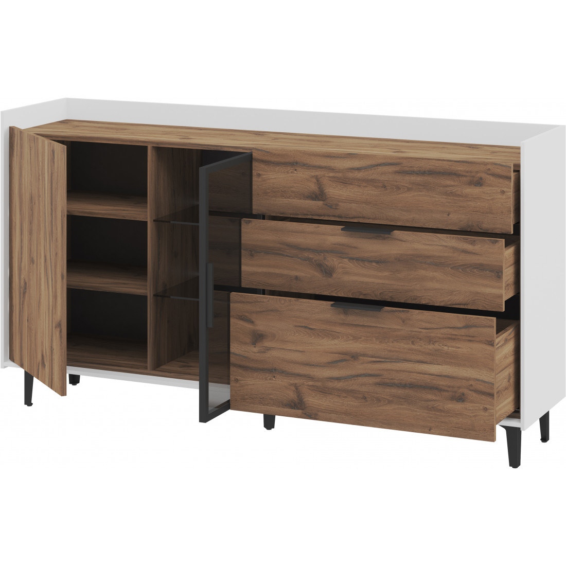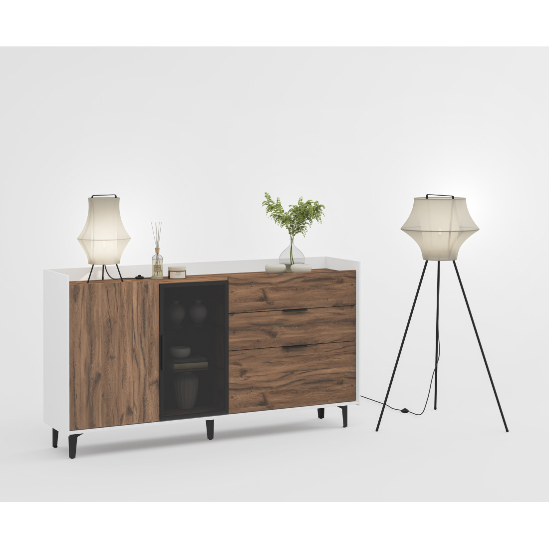 Элегантная тумба Модена создает идеальный акцент в вашей гостиной. Выберите из трех стильных вариантов цветов: Белый-Дуб Элисон, Лунный камень-жемчуг, Металл Бруклин-лунный жемчуг. Ножки из металла с регулировкой обеспечивают стабильность. Эта большая тумба идеально подходит для размещения телевизора и хранения посуды. Тумба оснащена темным стеклом и имеет три отделения: первое с двумя полками, второе с двумя стеклянными полками и фасадом из стекла, третье с тремя удобными ящиками. Функциональность и стиль объединяются в этой тумбе, делая ее идеальным дополнением к вашему интерьеру гостиной